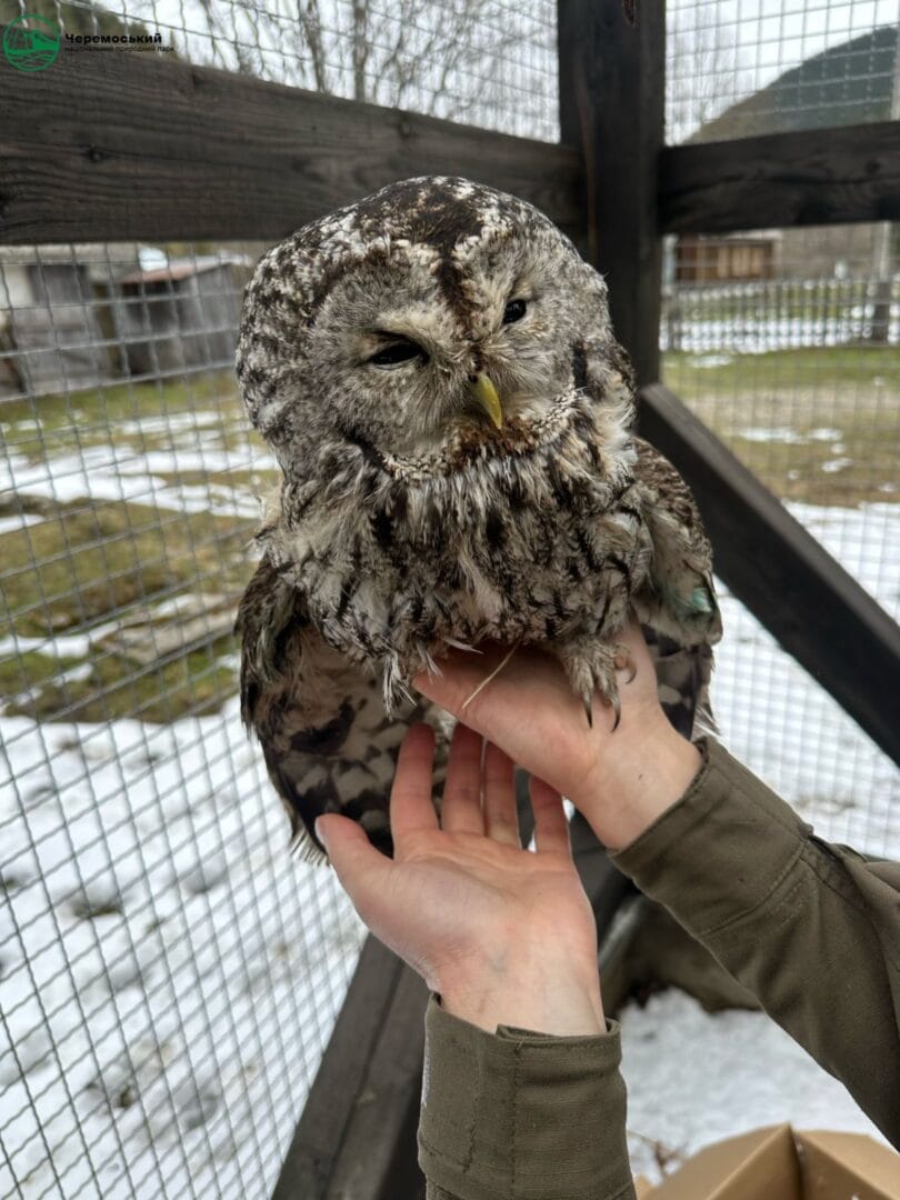 Нещодавно один із співробітників НПП «Черемоський» виявив у лісі неподалік свого дому сіру сову (Strix aluco), яка не могла піднятись у повітря. Під час огляду з’ясувалося: навколо шиї та крила птаха щільно обмотався металевий дріт, що травмував її та обмежував рух.